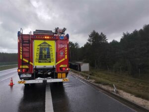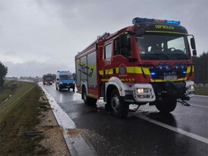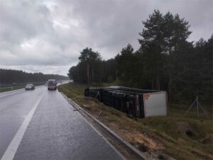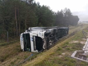 W dniu 17.09.2025 o godz. 12.05 SK KM PSP w Kielcach zadysponowało naszą jednostkę do zdarzenia drogowego z udziałem tira na drodze ekspresowej S7 na pograniczu miejscowości Tokarnia i Brzegi. Do zdarzenia wyjechał GBA-Rt 4,5/29,6 MAN TGM 18.320 319T14. Na miejscu okazało się, że tir zjechał z drogi, wpadł do rowu i przewrócił się na bok. Kierowca pojazdu w momencie przyjazdu zastępów straży pożarnej przebywał już poza autem i był pod opieką ratowników ZRM. Działania straży pożarnej polegały na rozpoznaniu i zabezpieczeniu miejsca zdarzenia.