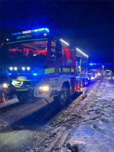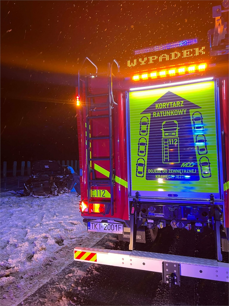 W dniu 12.01.2026 o godz. 04.38 SK KM PSP w Kielcach zadysponowało naszą jednostkę do zdarzenia drogowego na trasie S7 w miejscowości Tokarnia. Do działań wyjechał GBA-Rt 4,5/29,6 MAN TGM 18.320 319T14. Po dojeździe na miejscu zdarzenia stwierdzono, że auto osobowe wypadło z drogi i uderzyło w barierki. Kierowca pojazdu oraz pasażerowie nie odnieśli obrażeń i nie wymagali pomocy medycznej. Działania straży pożarnej polegały na zabezpieczeniu miejsca zdarzenia i odłączeniu akumulatora w uszkodzonym samochodzie.
